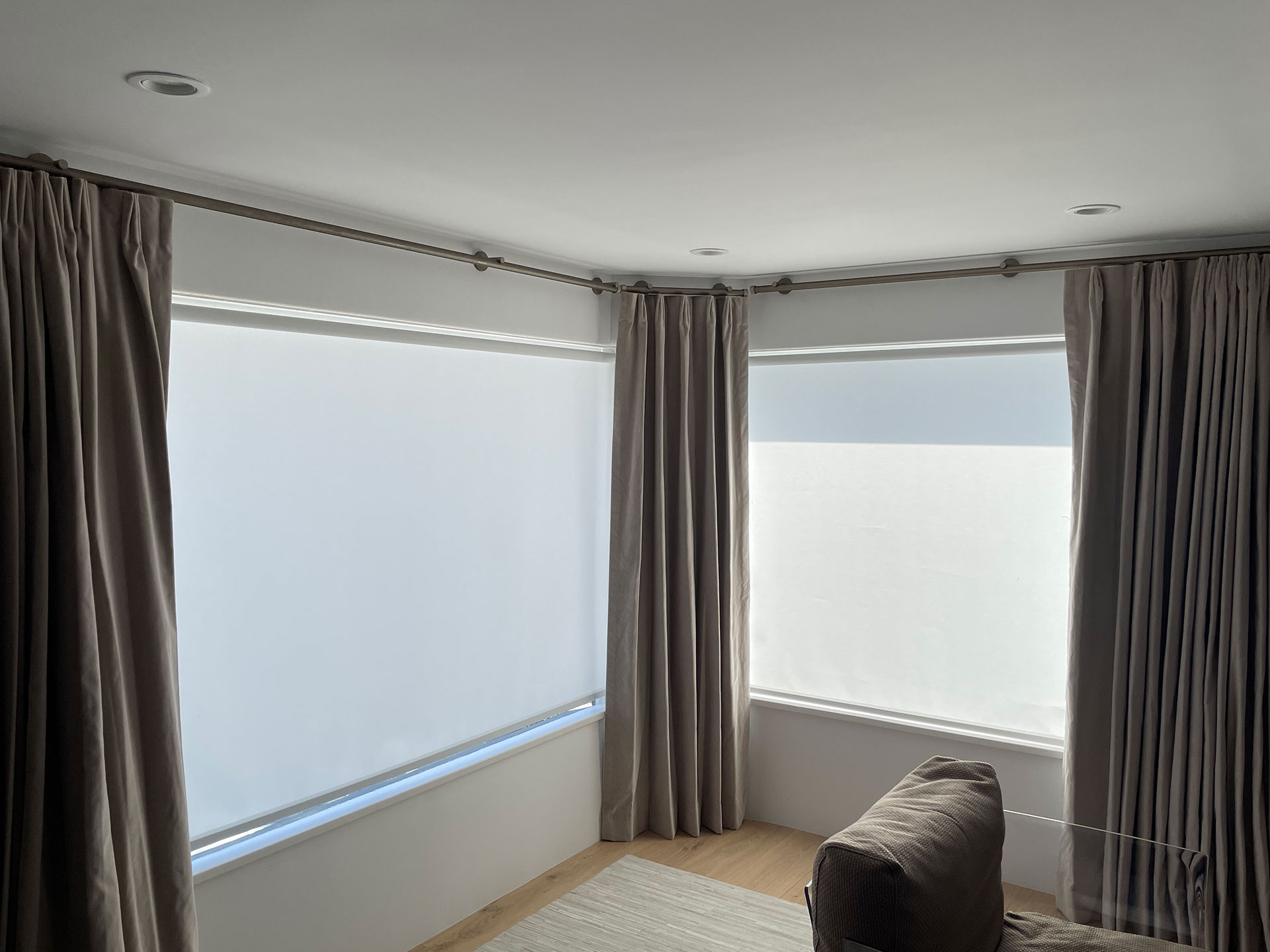 Slim-profile cellular and Roman shades preserve the architecture.